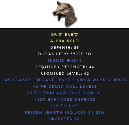 Required Level: 42+2 to Druid Skill LevelsDefense: 89+3 to Tornado (Druid only)Socketed (2)+22 to Life+42% Enhanced DefensePoison Length Reduced by 25%
