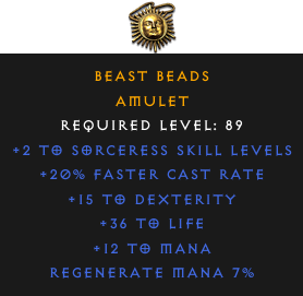 Required Level: 89+2 to Sorceress Skill Levels+20% Faster Cast Rate+15 to Dexterity+36 to LifeRegenerate Mana 7%+12 to Mana