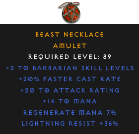 Required Level: 89+2 to Barbarian Skill Levels+20% Faster Cast Rate+20 to Attack RatingLightning Resist +36%Regenerate Mana 7%+14 to Mana