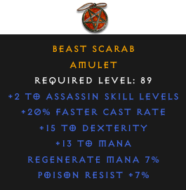 Required Level: 89+2 to Assassin Skill Levels+20% Faster Cast Rate+15 to DexterityPoison Resist +7%Regenerate Mana 7%+13 to Mana