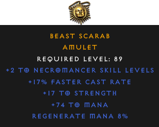 Required Level: 89+2 to Necromancer Skill Levels+17% Faster Cast Rate+17 to StrengthRegenerate Mana 8%+74 to Mana