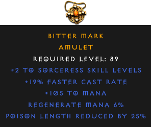 Required Level: 89+2 to Sorceress Skill Levels+19% Faster Cast RatePoison Length Reduced by 25%Regenerate Mana 6%+105 to Mana
