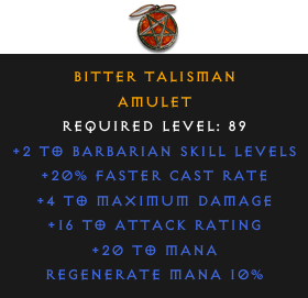 Required Level: 89+2 to Barbarian Skill Levels+20% Faster Cast Rate+4 to Maximum Damage+16 to Attack RatingRegenerate Mana 10%+20 to Mana