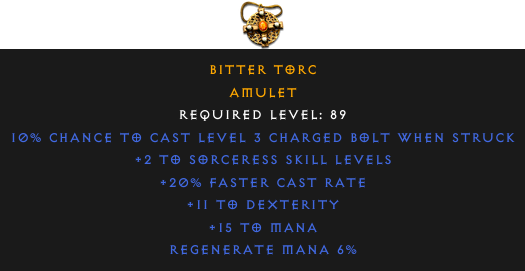 Required Level: 89+2 to Sorceress Skill Levels+20% Faster Cast Rate+11 to DexterityRegenerate Mana 6%+15 to Mana