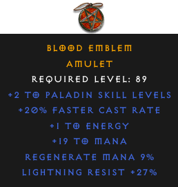 Required Level: 89+2 to Paladin Skill Levels+20% Faster Cast RateLightning Resist +27%Regenerate Mana 9%+19 to Mana+1 to Energy