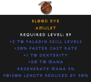 Required Level: 89+2 to Paladin Skill Levels+20% Faster Cast Rate+1 to DexterityPoison Length Reduced by 50%Regenerate Mana 5%+20 to Mana