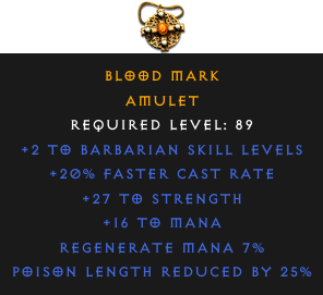 Required Level: 89+2 to Barbarian Skill Levels+20% Faster Cast Rate+27 to StrengthPoison Length Reduced by 25%Regenerate Mana 7%+16 to Mana