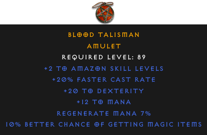Required Level: 89+2 to Amazon Skill Levels+20% Faster Cast Rate+20 to Dexterity10% Better Chance of Getting Magic ItemsRegenerate Mana 7%+12 to Mana