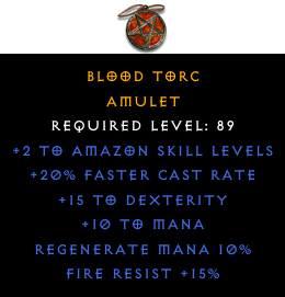Required Level: 89+2 to Amazon Skill Levels+20% Faster Cast Rate+15 to DexterityFire Resist +15%Regenerate Mana 10%+10 to Mana