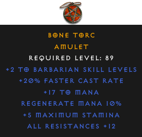 Required Level: 89+2 to Barbarian Skill Levels+20% Faster Cast RateAll Resistances +12+5 Maximum StaminaRegenerate Mana 10%+17 to Mana