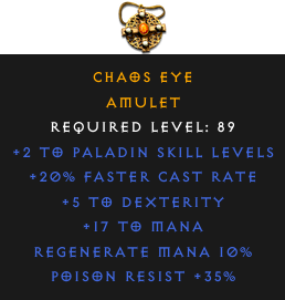 Required Level: 89+2 to Paladin Skill Levels+20% Faster Cast Rate+5 to DexterityPoison Resist +35%Regenerate Mana 10%+17 to Mana