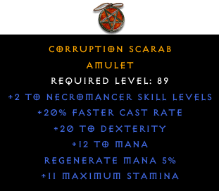 Required Level: 89+2 to Necromancer Skill Levels+20% Faster Cast Rate+20 to Dexterity+11 Maximum StaminaRegenerate Mana 5%+12 to Mana