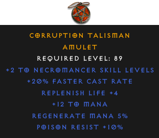 Required Level: 89+2 to Necromancer Skill Levels+20% Faster Cast RateReplenish Life +4Poison Resist +10%Regenerate Mana 5%+12 to Mana