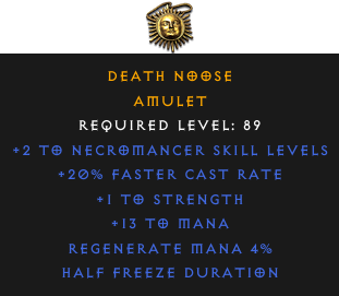 Required Level: 89+2 to Necromancer Skill Levels+20% Faster Cast Rate+1 to StrengthHalf Freeze DurationRegenerate Mana 4%+13 to Mana
