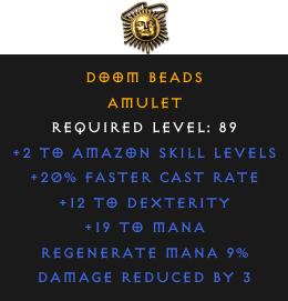 Required Level: 89+2 to Amazon Skill Levels+20% Faster Cast Rate+12 to DexterityRegenerate Mana 9%+19 to ManaDamage Reduced by 3