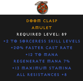Required Level: 89+2 to Sorceress Skill Levels+20% Faster Cast RateAll Resistances +8+13 Maximum StaminaRegenerate Mana 7%+12 to Mana