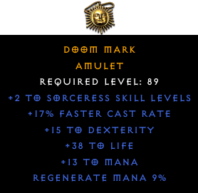 Required Level: 89+2 to Sorceress Skill Levels+17% Faster Cast Rate+15 to Dexterity+38 to LifeRegenerate Mana 9%+13 to Mana