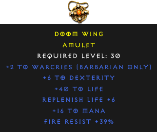 Required Level: 30+2 to Warcries (Barbarian only)+6 to DexterityReplenish Life +6+40 to LifeFire Resist +39%+16 to Mana