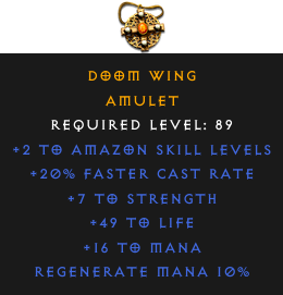 Required Level: 89+2 to Amazon Skill Levels+20% Faster Cast Rate+7 to Strength+49 to LifeRegenerate Mana 10%+16 to Mana