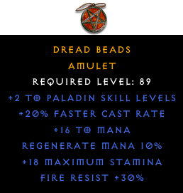 Required Level: 89+2 to Paladin Skill Levels+20% Faster Cast RateFire Resist +30%+18 Maximum StaminaRegenerate Mana 10%+16 to Mana