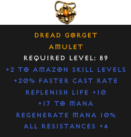 Required Level: 89+2 to Amazon Skill Levels+20% Faster Cast RateReplenish Life +10All Resistances +4Regenerate Mana 10%+17 to Mana