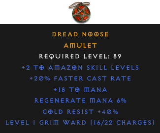 Required Level: 89+2 to Amazon Skill Levels+20% Faster Cast RateCold Resist +40%Regenerate Mana 6%+18 to Mana