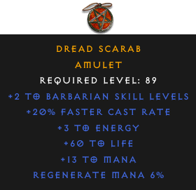 Required Level: 89+2 to Barbarian Skill Levels+20% Faster Cast Rate+60 to LifeRegenerate Mana 6%+13 to Mana+3 to Energy