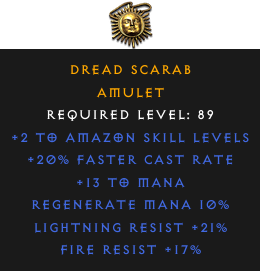 Required Level: 89+2 to Amazon Skill Levels+20% Faster Cast RateLightning Resist +21%Fire Resist +17%Regenerate Mana 10%+13 to Mana