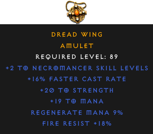 Required Level: 89+2 to Necromancer Skill Levels+16% Faster Cast Rate+20 to StrengthFire Resist +18%Regenerate Mana 9%+19 to Mana