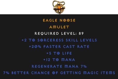 Required Level: 89+2 to Sorceress Skill Levels+20% Faster Cast Rate7% Better Chance of Getting Magic Items+5 to LifeRegenerate Mana 7%+12 to Mana