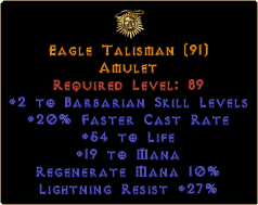 Required Level: 89+2 to Barbarian Skill Levels+20% Faster Cast Rate+54 to Life+19 to ManaRegenerate Mana 10%Lightning Resist +27%