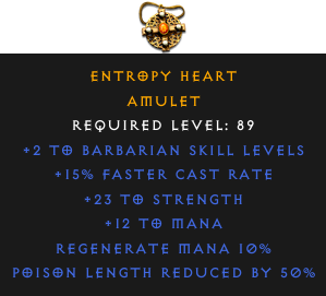 Required Level: 89+2 to Barbarian Skill Levels+15% Faster Cast Rate+23 to StrengthPoison Length Reduced by 50%Regenerate Mana 10%+12 to Mana