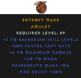 Required Level: 89+2 to Barbarian Skill Levels+20% Faster Cast Rate+4 to Maximum DamageFire Resist +20%Regenerate Mana 10%+20 to Mana