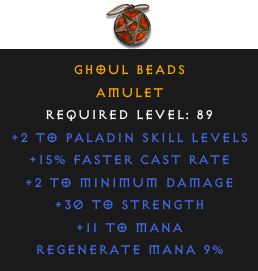 Required Level: 89+2 to Paladin Skill Levels+15% Faster Cast Rate+30 to StrengthRegenerate Mana 9%+2 to Minimum Damage+11 to Mana
