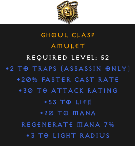 Required Level: 52+2 to Traps (Assassin only)+20% Faster Cast Rate+30 to Attack Rating+53 to Life+3 to Light RadiusRegenerate Mana 7%+20 to Mana