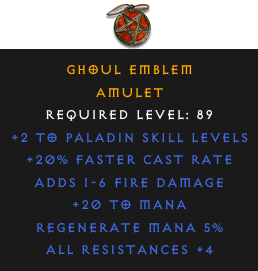 Required Level: 89+2 to Paladin Skill Levels+20% Faster Cast RateAll Resistances +4Adds Fire DamageRegenerate Mana 5%+20 to Mana