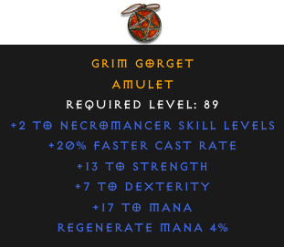 Required Level: 89+2 to Necromancer Skill Levels+20% Faster Cast Rate+13 to Strength+7 to DexterityRegenerate Mana 4%+17 to Mana