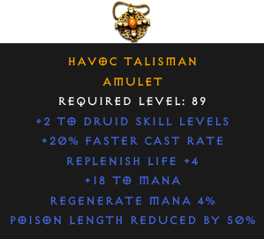 Required Level: 89+2 to Druid Skill Levels+20% Faster Cast RateReplenish Life +4Poison Length Reduced by 50%Regenerate Mana 4%+18 to Mana