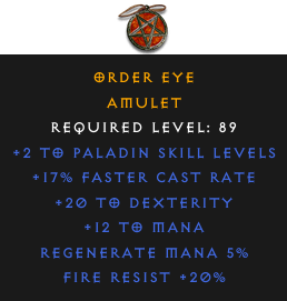 Required Level: 89+2 to Paladin Skill Levels+17% Faster Cast Rate+20 to DexterityFire Resist +20%Regenerate Mana 5%+12 to Mana