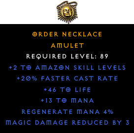 Required Level: 89+2 to Amazon Skill Levels+20% Faster Cast Rate+46 to LifeRegenerate Mana 4%+13 to ManaMagic Damage Reduced by 3