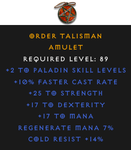 Required Level: 89+2 to Paladin Skill Levels+10% Faster Cast Rate+25 to Strength+17 to DexterityCold Resist +14%Regenerate Mana 7%+17 to Mana