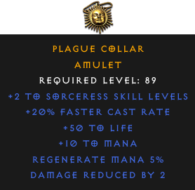 Required Level: 89+2 to Sorceress Skill Levels+20% Faster Cast Rate+50 to LifeRegenerate Mana 5%+10 to ManaDamage Reduced by 2