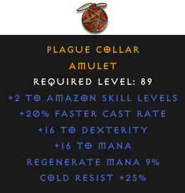 Required Level: 89+2 to Amazon Skill Levels+20% Faster Cast Rate+16 to DexterityCold Resist +25%Regenerate Mana 9%+16 to Mana