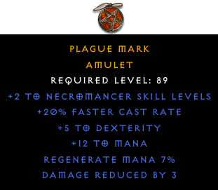 Required Level: 89+2 to Necromancer Skill Levels+20% Faster Cast Rate+5 to DexterityRegenerate Mana 7%+12 to ManaDamage Reduced by 3