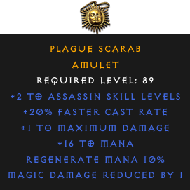Required Level: 89+2 to Assassin Skill Levels+20% Faster Cast Rate+1 to Maximum DamageRegenerate Mana 10%+16 to ManaMagic Damage Reduced by 1