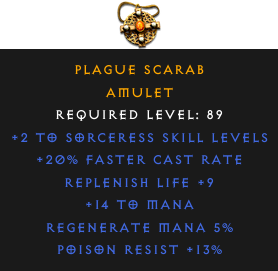 Required Level: 89+2 to Sorceress Skill Levels+20% Faster Cast RateReplenish Life +9Poison Resist +13%Regenerate Mana 5%+14 to Mana