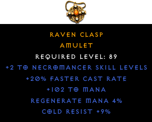 Required Level: 89+2 to Necromancer Skill Levels+20% Faster Cast RateCold Resist +9%Regenerate Mana 4%+102 to Mana