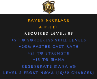 Required Level: 89+2 to Sorceress Skill Levels+20% Faster Cast Rate+21 to StrengthRegenerate Mana 6%+15 to Mana