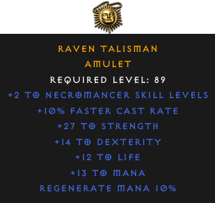 Required Level: 89+2 to Necromancer Skill Levels+10% Faster Cast Rate+27 to Strength+14 to Dexterity+12 to LifeRegenerate Mana 10%+13 to Mana