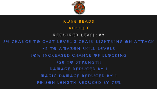Required Level: 89+2 to Amazon Skill Levels10% Increased Chance of Blocking+28 to StrengthPoison Length Reduced by 75%Magic Damage Reduced by 1Damage Reduced by 1